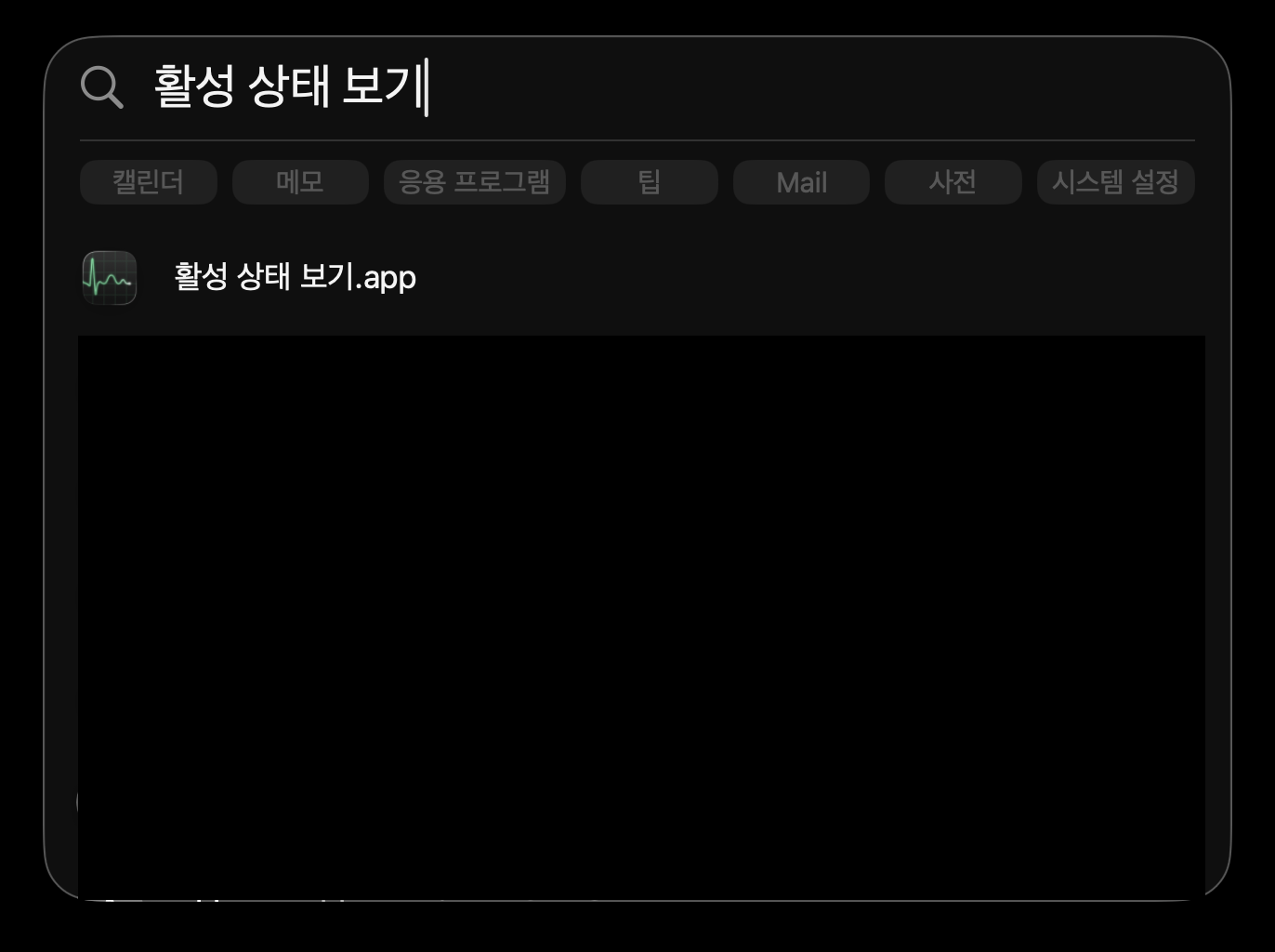 먼저 '활성 상태 보기' 앱을 실행! 어떻게 실행하는지 모르겠으면 Command + Space 키를 눌러서 활성 상태 보기를 입력하면 된다