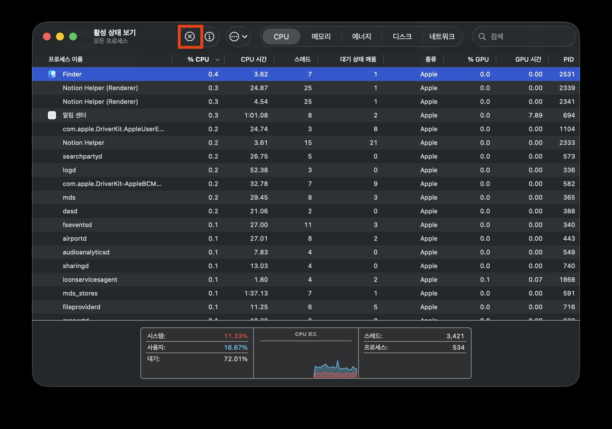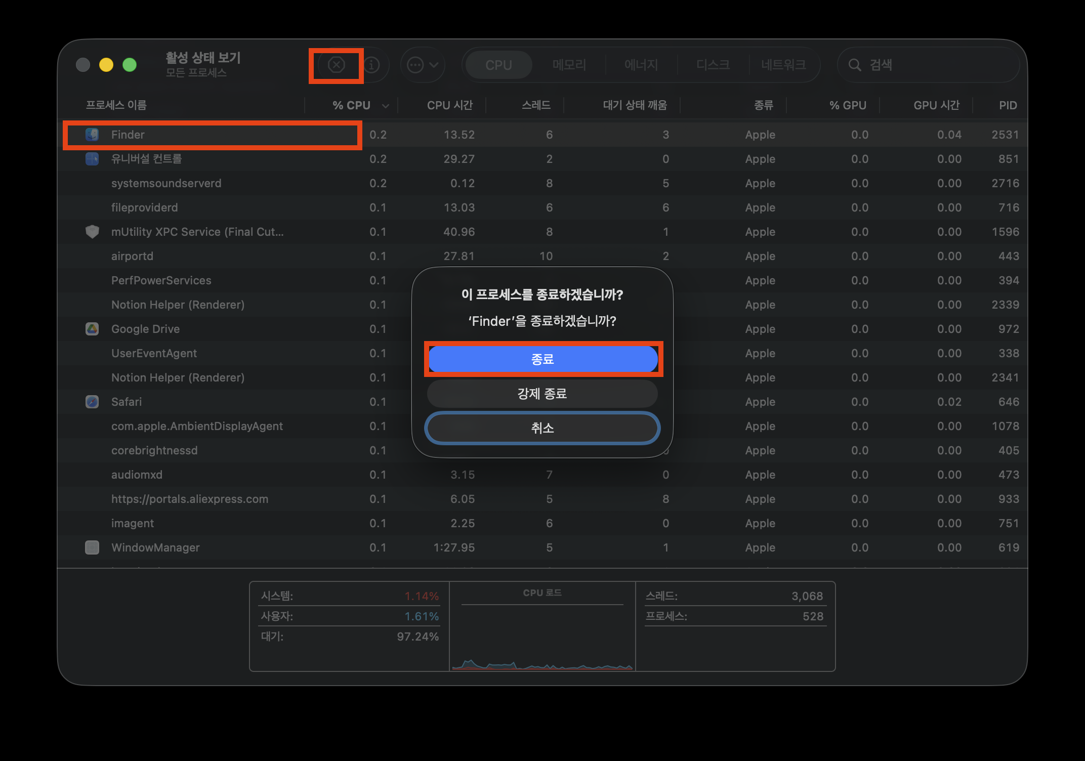 파인더를 선택하고 상단 프로세스 종료 버튼을 누르자