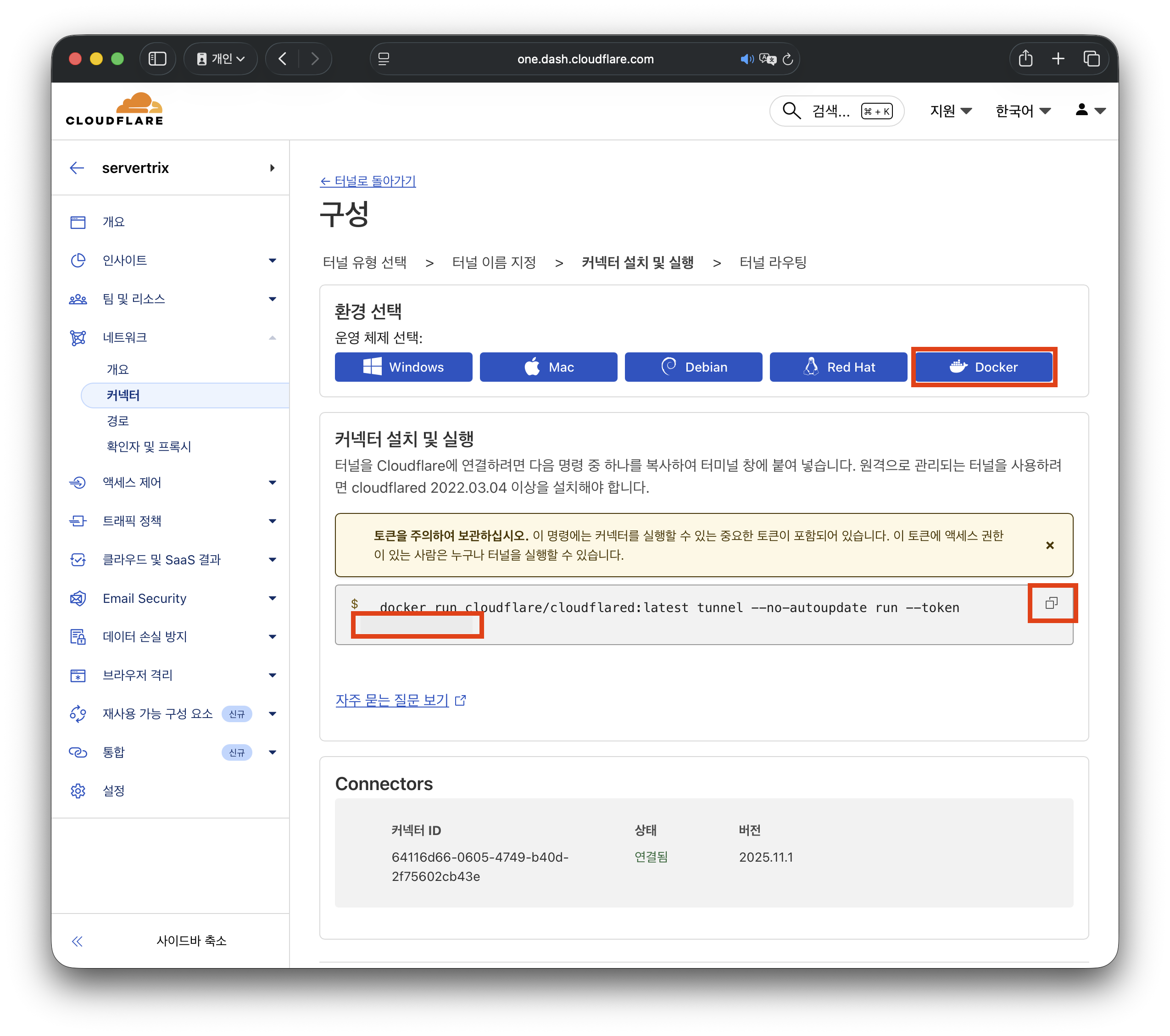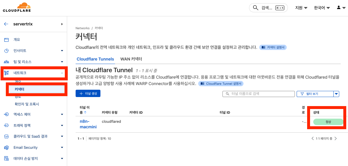 10. 클라우드플레어에서 커넥터 상태가 정상인지 확인