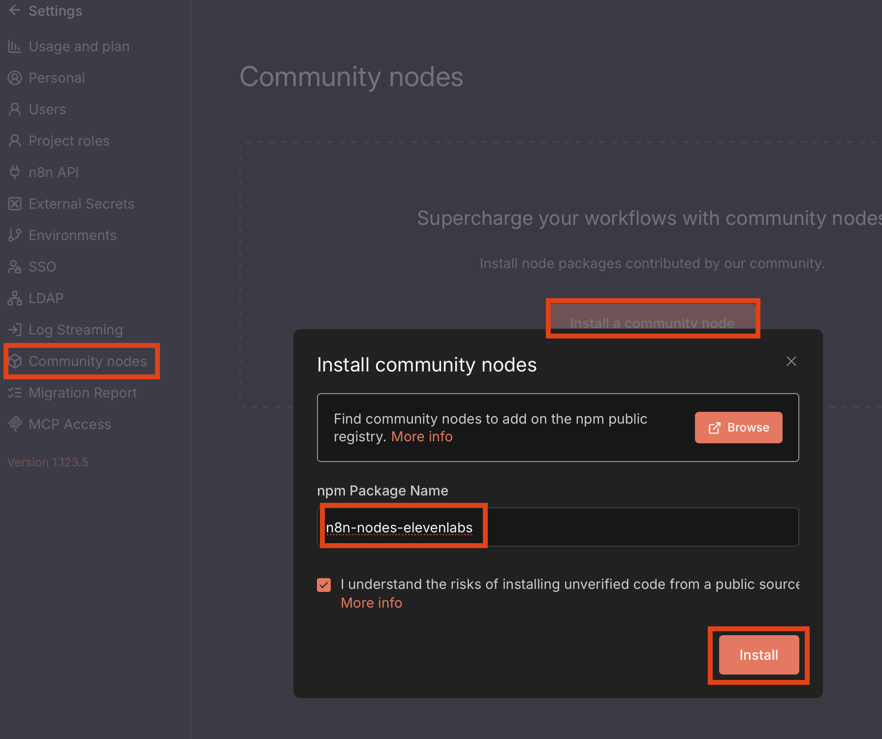 tts를 사용하려고 하는데 일레븐랩스 노드가 검색되지 않는다면 커뮤니티 노드에서 설치를 해보자