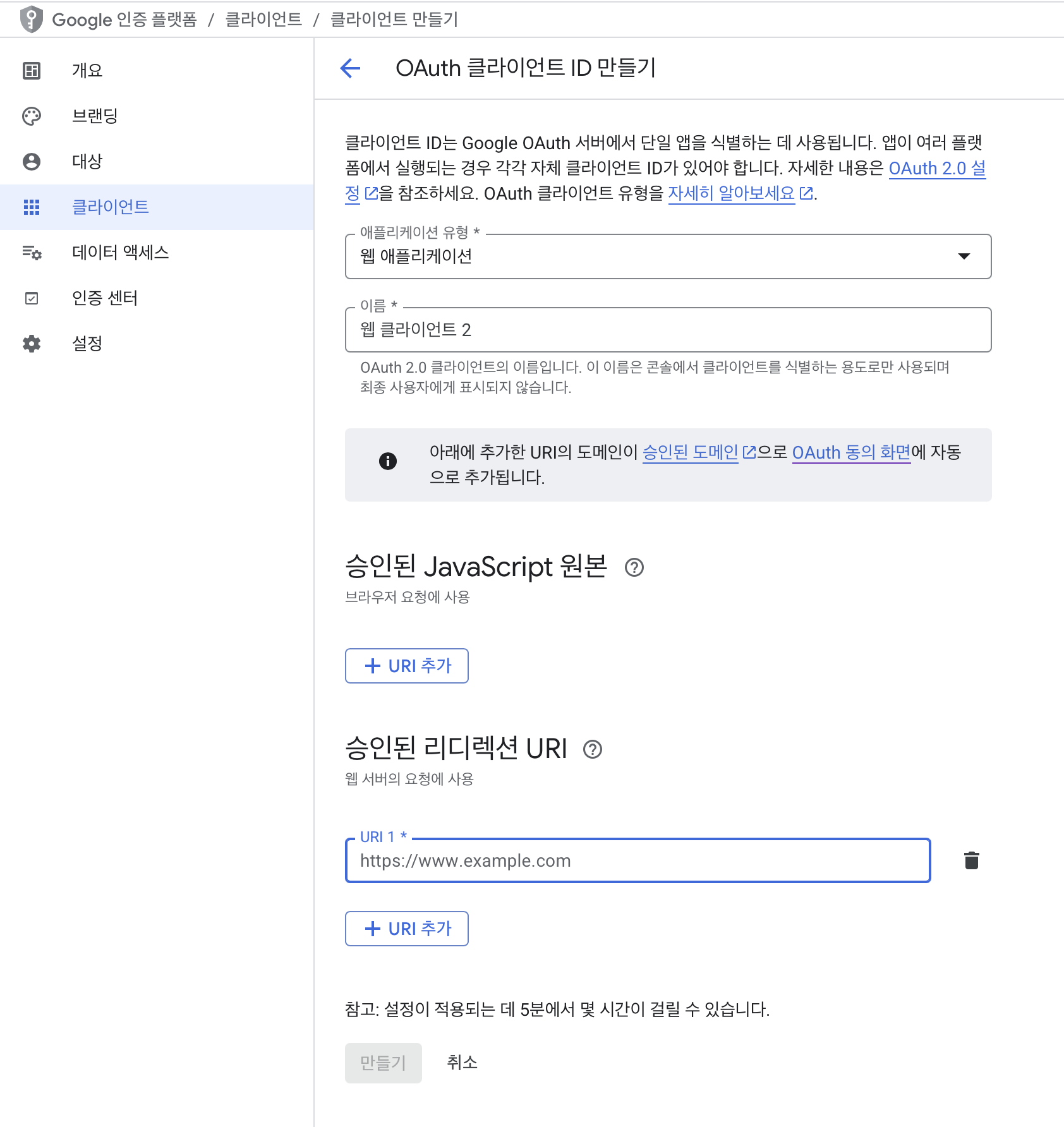 Google Cloud Console에서 OAuth 2.0 클라이언트 생성