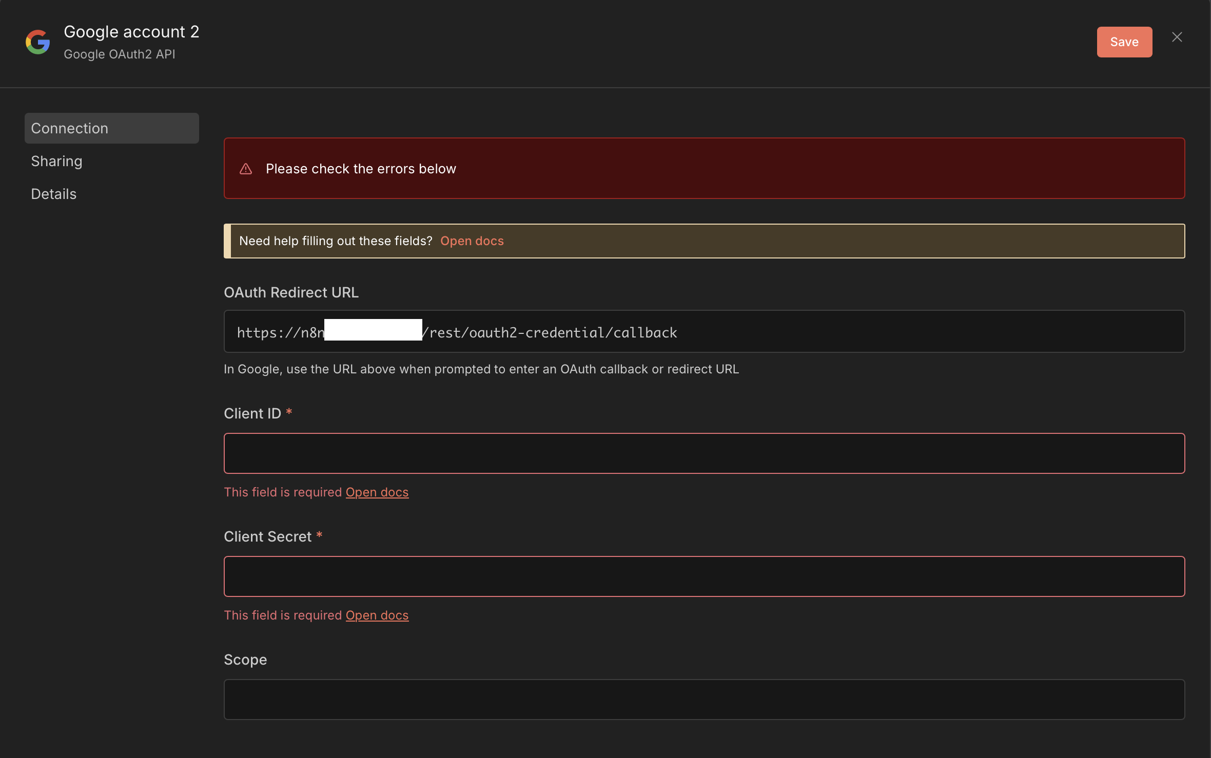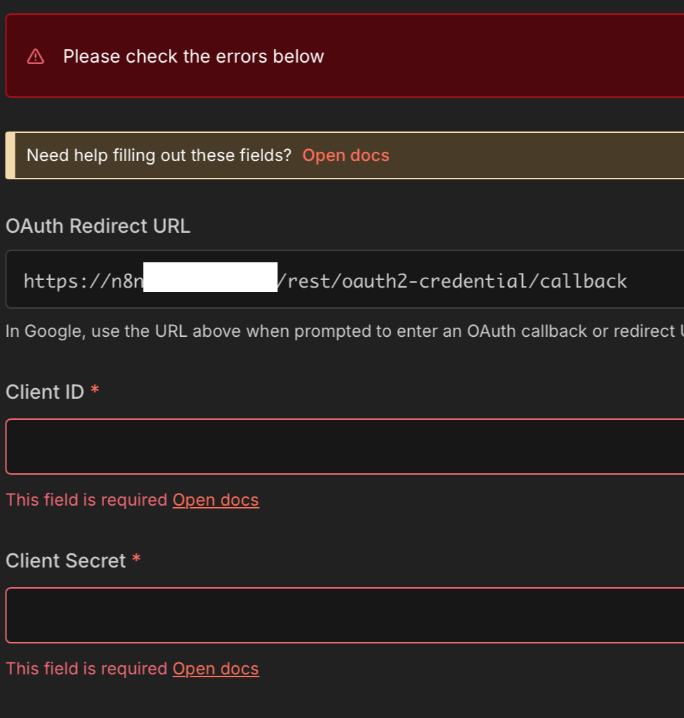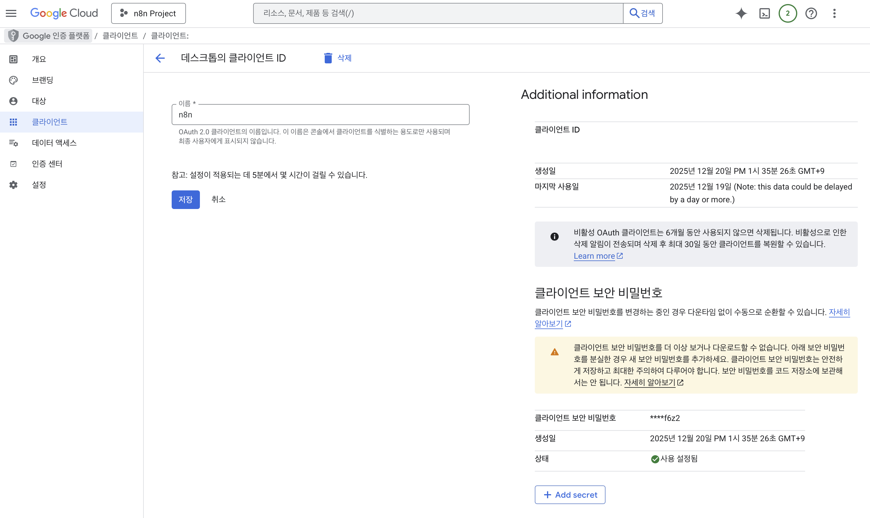 6. 생성 후 클라이언트 ID와 클라이언트 시크릿 복사해서 n8n 화면에 붙여넣기