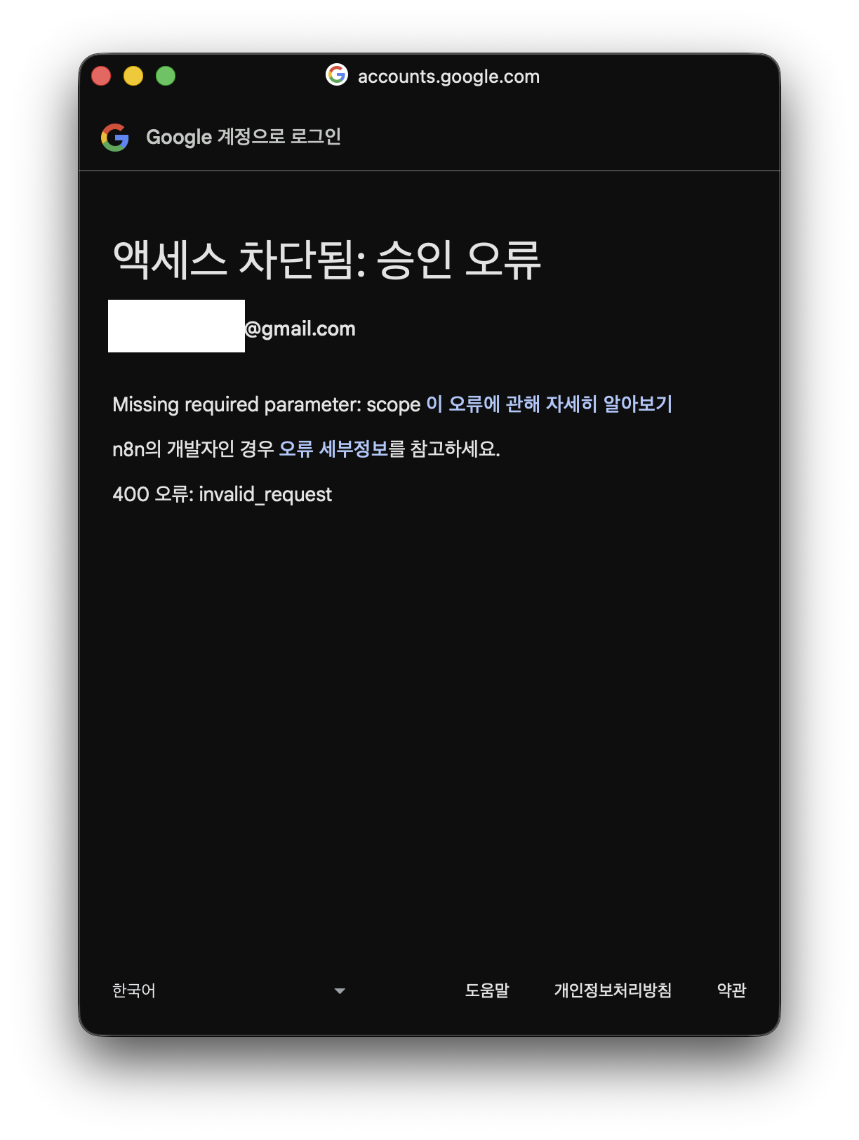 그런데 구글 계정으로 로그인 하는 과정 중에 "액세스 차단됨: 승인 오류"라는 메시지가 뜨고 진행이 안된다