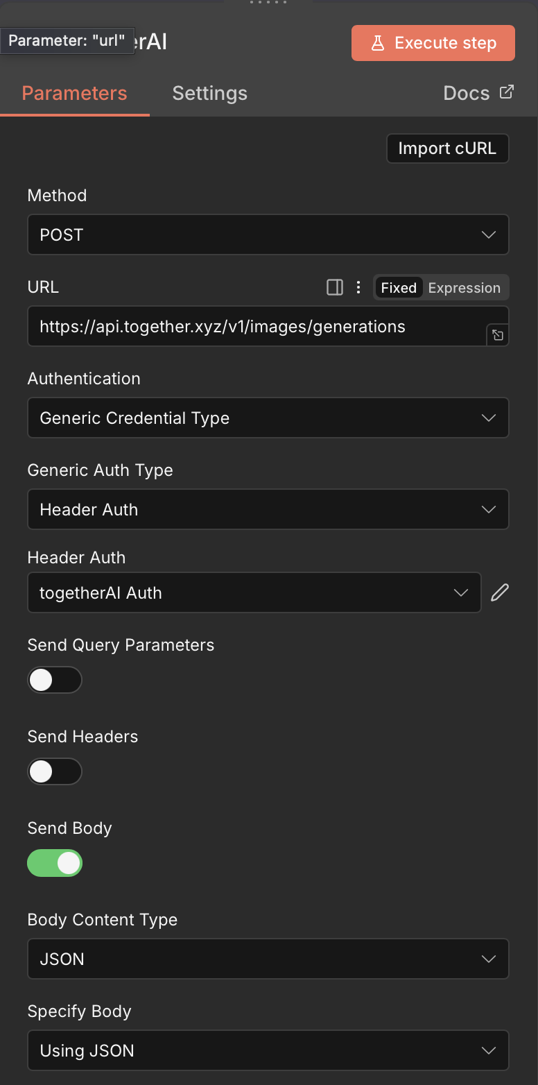 기존 이미지 생성 노드 위치에 HTTP Request 노드를 추가하고 아래와 같이 설정하세요: