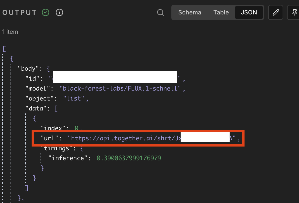 Together AI API는 이미지 파일 대신 **이미지 주소(URL)**를 JSON 응답으로 돌려줍니다. 덕분에 번거로운 업로드 과정 없이 바로 블로그에 넣을 수 있어 매우 편리합니다.