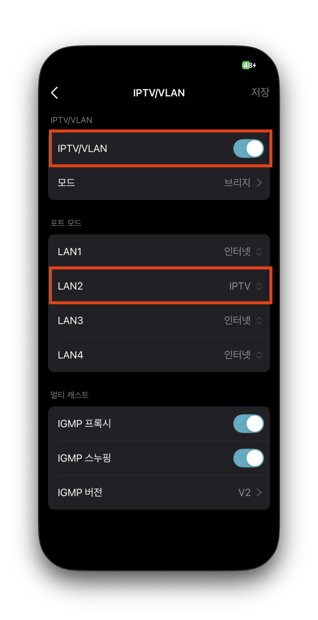 IGMP Snooping (인터넷 그룹 관리 프로토콜 스누핑): IPTV는 '멀티캐스트'라는 방식으로 신호를 쏘는데, 이게 일반 데이터와 섞이면 네트워크가 과부하 걸릴 수 있다. 이 기능은 공유기가 IPTV 신호만 딱 골라내서 셋톱박스로만 정확하게 전달해 주는 역할을 한다.